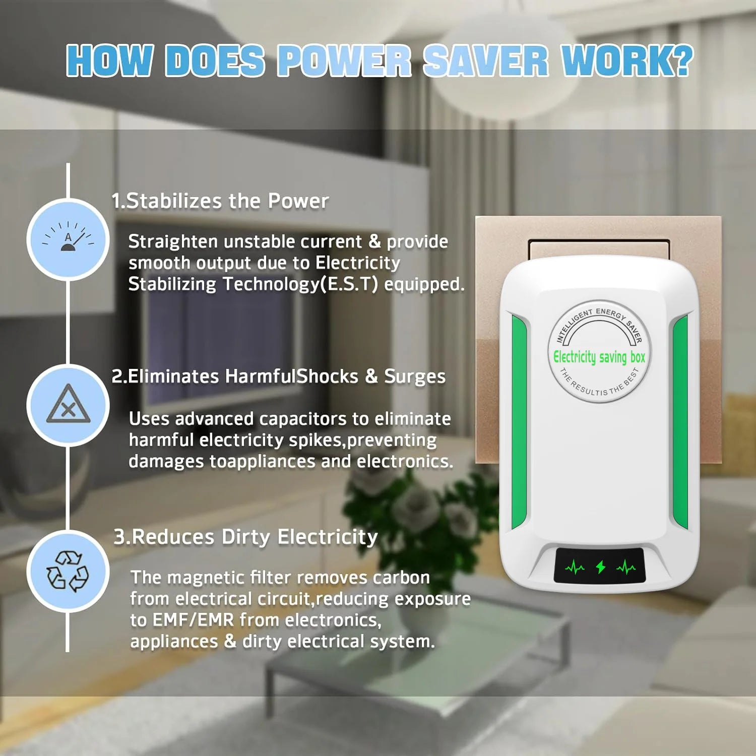Uses advanced capacitors to eliminate harmful electricity spikes, preventing damages to appliances and electronics.